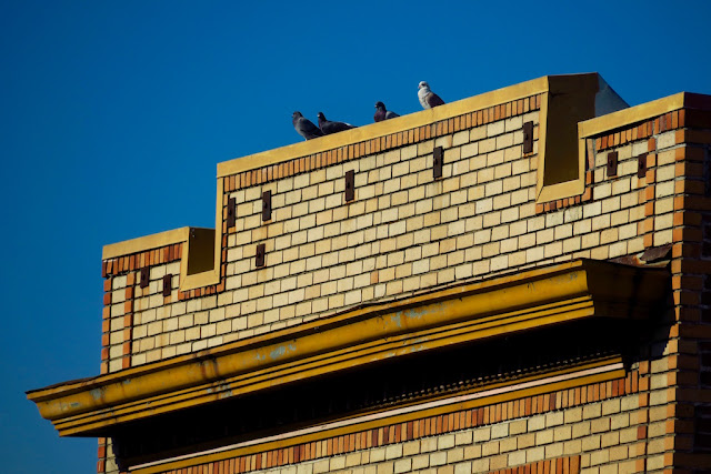 Like this silly shot of pigeons on top of a yellow brick building. There's nothing in the whole to suggest this would be an interesting picture but the color...the brick set against the sky with the straight lines...broken only by the irregular placement of the pigeons. It calls to me.